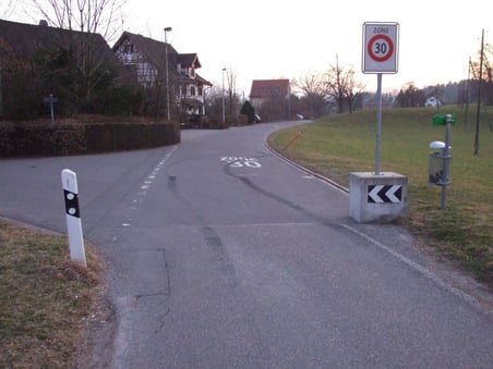 Diese Spuren einer – offensichtlich nicht folgenlos gebliebenen – Amokfahrt mit massivst übersetzter Geschwindigkeit im Tempo-30-Bereich finden sich auf der Ellenbogenstrasse unmittelbar beim Ortseingang in Oberwolfhausen. Die Bremspur lässt auf ein Tempo um die 80 bis 100 km/h schliessen. Absoluter Wahnsinn!