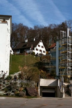 Die Bauprofile für eine Terrassenüberbauung auf der letzten noch freigebliebenen Parzelle zeigen es an: Vom einstigen Rebberg oberhalb der Lochrüti in Wolfhausen wird in Kürze keine Spur mehr zu sehen sein. Der Rebberg (Bild oben) bestand laut Lokalhistoriker Walter Messmer bis 1918. Das Bild stammt ungefähr aus dem Jahr 1910. Die Überbauung des Hangs begann Mitte der achtziger Jahre: Zunächst wurde die Reihenhaussiedlung im Landhausstil (Haus im Hintergrund) erstellt. Im Flurnamen dieser Siedlung – "In der Reben" – lebt die einstige Bestimmung des steilen Südhangs noch fort. Später folgten die mehrstöckigen Mehrfamilienhäuser an der Lochrütistrasse. Oberhalb des Bauernhofs Wisshalden ist der östliche Teil des Rebhangs noch erhalten.