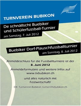 Wie bereits im vergangenen Jahr findet das grosse Sportwochennde in Bubikon – "De schnällscht Buebiker", Schüler-Fussballturnier und Dorf-Plauschfussball-turnier – nicht wie in früheren Jahren im Spätsommer, sondern bereits vor den Sommerferien statt, nämlich am 7. und 8. Juli 2012 – ohne Verschiebedatum. Anmeldeschluss für die Fussballturniere ist am 8. Juni 2012, wie es auf der Website des Turnvereins Bubikon, Organisator des Anlasses, heisst.