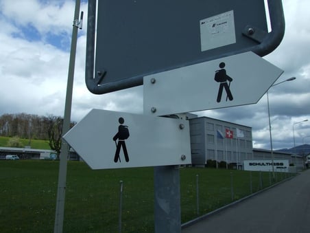 Für Freunde exotischer Verkehrsschilder findet sich beim Schulthess-Fussgängerstreifen an der Landstrasse in Wolfhausen eine Trouvaille: ein weisses Wanderwegschild. Gibt es das überhaupt? Das 68 Seiten umfassende, offizielle "Handbuch Signalisation Wanderwege" des Bundesamt für Strassen ASTRA ist unerbittlich: Wanderwegschilder gibt es nur in Gelb (Wanderwege), Weiss-Rot-Weiss (Bergwanderwege) und Weiss-Blau-Weiss (Alpinwanderwege). Ausnahmen sind unzulässig, ebenso wie eine andere als die vorgeschriebene Schrift (ASTRA Frutiger Standard).