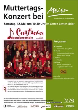 Am Samstag, 12. Mai (10.30 Uhr, Garten-Center Meier) präsentiert das Jugendensemble "con fuoco" unter der Leitung der Rütner Dirigentin Verena Zeller sein Können. Gespielt werden Werke unter anderen von W.A. Mozart und A. Vivaldi. Das Konzert ist gewissermassen die Generalprobe vor heimischem Publikum, bevor das Ensemble über das Auffahrtswochenende nach Italien ans europäische Jugendmusikfestival "Allegromosso" reist. "Con fuoco" wurde nämlich ausgewählt, als eines der Schweizer Jugendorchester an diesem internationalen Festival mit über 5000 jungen Musikerinnen und Musikern aus 26 Ländern teilzunehmen. An der Küste und im Landesinnern der Emilia Romagna finden im Rahmen dieses Festivals über 200 Konzerte statt. Alle Kinder des Ensembles "con fuoco" stammen aus dem Raum Bubikon / Wolfhausen / Rüti / Grüningen. Der Eintritt zum Konzert im Garten-Center Meier ist frei; es wird eine Kollekte für die Reise nach Italien erhoben.
