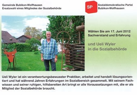 Nachdem die EDU Anfang Woche einen Flyer für ihre Kandidatin Daniela Wüthrich lanciert hatte, ist nun auch die SP mit einem eigenen Flyer in den Wahlkampf um den vakanten Sitz in der Sozialbehörde eingestiegen. Sie preist darin ihren Kandidaten Ueli Wyler als "verantwortungsbewussten Politiker" an, der "während Jahren Erfahrungen im Sozialbereich gesammelt" habe: "Mit seiner ruhigen, hilfsbereiten Art" bringe er "alle Voraussetzungen mit", die er als Mitglied der Soazilbehörde brauche. Der Flyer ist von zahlreichen prominenten Bubiker Persönlichkeiten mitunterzeichnet, darunter aktive Behördenmitglieder wie Schulpräsident Hans Murer, Gemeinderat Daniel List und Schulpflegerin Karin Bachmann. Ihre Unterstützung bekunden auch die ehemaligen Behördenmitglieder Kathrin Knüsel (Schulpflege) und Käthy Angele (Gemeinderat). Die Ersatzwahl an der Urne findet am 17. Juni statt.