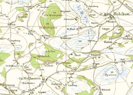 Auf dieser Karte unserer Gemeinde finden Sie Ihr Wohnhaus mit grosser Wahrscheinlichkeit nicht. Es handelt sich um einen Ausschnitt aus der so genannnten Wild-Karte, einer zwischen 1843 und 1851 unter der Leitung von Joahnnes Wild aus Richterswil entstandenen Sammlung von 32 Einzelkarten im Massstab 1:25 000. Die meisten Flurnamen sind uns auch heute noch sehr vertraut, allerdings meist nicht mehr als Äcker, Weiden und Fluren, sondern als Bushaltestellen, Wohnquartiere oder gar Industriegebiete. Der Egelsee schien damals noch kein exakt abgegrenztes Gewässer gewesen zu sein; er ist in der Schraffur der Riede und Sümpfe gezeichnet, wie das Hüsliriet. Bereits eingezeichnet ist die Bahntrasse der Glatttalbahn, obschon diese erst 1858 in Betrieb genommen wurde. Bubikon und Wolfhausen bestanden aus ein paar wenigen Häusern, Wolfhausen zählte etliche Weinberge. Jener in Bubikon beim Kapf ist bekanntlich vor einigen Jahren wiederstanden.