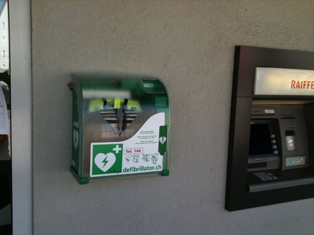 In Wolfhausen sorgte die Montage des Geräts gleich neben dem Raiffeisen-Bancomaten auch für witzige Bemerkungen. Damit sei vorgesorgt für den Fall, dass man beim Abfragen des Kontostands einen Schock erleide, meinte etwa ein Passant...