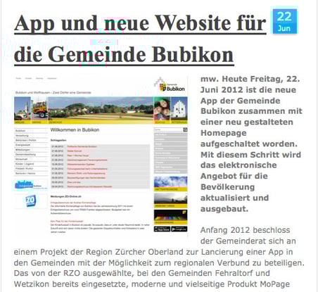 Selbstverständlich berichtet auch der ZO in seiner Onlineausgabe über die Website der Gemeinde Bubikon (Bild links). Und er verwendet den fast identischen Screenshot wie "buebikernews" in seiner Meldung von heute früh (Bild unten). Mit einem kleinen Unterschied: Das im ZO publizierte Bild ist genau so geschnitten, dass das "buebikernews"-Banner unten rechts nicht mehr sichtbar ist.