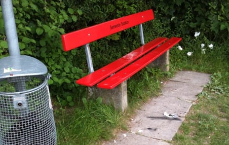 "So close, no matter how far...so nahe, egal wie weit entfernt" – so beginnt eine der bekanntesten Balladen der Rockband Metallica. Für die Benützer dieses Bänkleins in Oberwolfhausen – offensichtlich aus einer Generation nach Metallica stammend – gilt genau das Gegenteil: Der Abfallkübel kann noch so nahe sein, er ist immer noch zu weit entfernt, um den Unrat darin zu entsorgen.