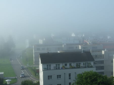 Nach einer klaren Vollmondnacht schlich sich gegen Morgen dichter Nebel in Wolfhausen ein. Nebel im Hochsommer? Naja: Schliesslich hat die Sonne am 21. Juni den nördlichen Scheitelpunkt