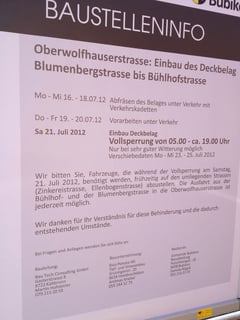 An der Oberwolfhauserstrasse in Wolfhausen finden diese Woche umfangreiche Sanierungsarbeiten statt. Für den Einbau eines neuen Deckbelags wird der Abschnitt zwischen der Blumenbergstrasse und und der Bühlhofstrasse am kommenden Samstag von 05.00 Uhr bis 19.00 Uhr total gesperrt. Weil dies nur bei sehr guter Witterung möglich ist, sind als Verschiebedaten Montag bis Mittwoch, 23. bis 25. Juli, möglich. Autos, die während der Sperrung benötigt werden, sollten rechtzeitig in den umliegenden Strassen (Zinkereistrasse, Ellenbogenstrasse) abgestellt werden. Die Ausfahrt aus der Bühlhof- und der Blumenbergstrasse in die Oberwolfhauserstrasse soll jedoch gemäss Baustelleninfo jederzeit möglich sein.