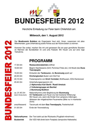 Die Prognose verspricht – abgesehen von einem geringen Gewitterrisiko – Bundesfeierwetter der ersten Klasse, und so steht morgen Mittwoch einem Gang zum Festgelände im Chilehölzli zwischen Bubikon und Wolfhausen nichts entgegen. Das Programm enthält zahlreiche musikalische Höhepunkte, und im offiziellen Teil bestreitet Festredner Erich Vontobel seinen ersten Auftritt als frischgewählter EDU-Kantonsrat vor heimischem Publikum.