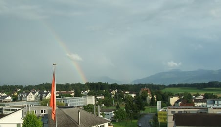Vom Obersee her nähert sich ein Gewitter, im Westen hält die Abendsonne dagegen. Das Ergebnis eines solchen "Kampfes" der Naturgewalten ist immer ein Regenbogen. Wussten Sie, dass am Ende des Regenbogens ein Goldschatz vergraben liegt? In diesem Falle dürfte dies durchaus zutreffen, denn der Regenbogen endet irgendwo in einer reichen Ausserschwyzer Steueroase....