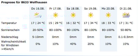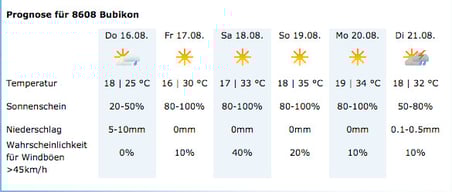 Dabei haben wir eine interessante Entdeckung gemacht: Bei ansonsten identischer Prognose unterscheiden sich die Temperaturvorhersagen für Bubikon und Wolfhausen durchwegs jeweils um ein Grad. In Bubikon ist es immer ein Grad wärmer als in Wolfhausen! Das mag in den nächsten Hitzetagen für die Wolfhauser ein Vorteil sein. Bald kommt aber der Herbst, und da würden wir Wolfhauser ja gerne auch ein wenig Heizenergie sparen. Eigentlich würde man ja das Gegenteil erwarten: Bubikon ist oft der Bise ausgesetzt, während man in Wolfhausen, geschützt durch die Botzflue, die Südlage geniesst.