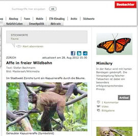 Der Affe vom Zürichberg – das ist kein Sozialneid, sondern Tatsache: Im Zürcher Zoo ist, wie der "Beobachter" berichtet, ein Kapuziner-Äffchen abgehauen. Jetzt macht es die Wälder am Zürichberg unsicher. Und bitte, liebe Zürcher Oberländer: Wenn ihr dem putzigen Tier begegnet, macht es nicht so wie Taglöhner Richi Müller im Jahr 1934, als er einen in Zürich entflohenen Schwarzen Panther stellte ""buebikernews" berichtete), sondern meldet euch beim Zoo Zürich (Telefon 0848 966 983).