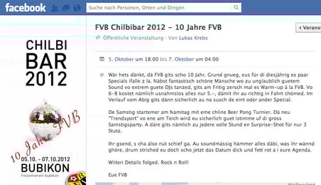 Der vor zehn Jahren gegründete Freizeitverein Bubikon möchte dieses Jahr an der Bubiker Chilbi, wo der FVB traditionellerweise eine Chilbibar betreibt, sein Jubiläum tüchtig feiern. Auf mehreren Eventportalen, namentlich aber auf Facebook, hat der FVB Aufrufe und Einladungen für "diverse Specials" eingestellt. So soll es am Chilbifreitag (5. Oktober) zuerst einmal ein "Warm-up à la FVB" geben: "Vo 6-8 kostet nämlich usnahmslos alles nur 5.-, dämit ihr au richtig in Fahrt chömed", heisst es in der Facebook-Einladung. Am Chilbisamstag soll dann der Nachmittag mit einem "Beer Pong Turnier" beginnen: "Dä neu "Trendsport" vo ene am Teich wird eu sicherlich guet istimme uf di gross Samstigsparty." An dieser Party gebe es dann zu jeder vollen Stunde einen "Surprise-Shot" für "nur 3 Stutz".