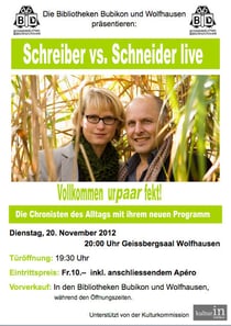 In der "Coopzeitung" berichten "Schreiber vs. Schneider" – bürgerlich Sybil Schreiber und Steven Schneider – wöchentlich aus ihrem Familienleben. Daneben bietet das Paar auch allerhand originelle Kurse an und tritt live auf. Am 20. November sind die beiden mit ihrem Programm "Vollkommen unpaarfekt" auf Einladung der Bibliotheken Bubikon und Wolfhausen zu Gast in unserer Gemeinde, und zwar um 20.00 Uhr im Geissbergsaal Wolfhausen.