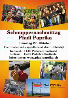 Am 27. Oktober können Kinder (ab dem 1. Chindgsi) und Jugendliche wieder Pfadiluft schnuppern: Die Pfadi Paprika (Rüti, Tann, Dürnten, Bubikon, Wolfhausen) führt einen Kennenlern-Nachmittag durch, bei dem es darum geht, Dagobert Ducks verschwundenen Geldbeutel wiederzufinden. Treffpunkt ist um 14.00 Uhr beim Parkplatz Rütiwald in Rüti, wo um 16.30 Uhr der Nachmittag auch endet. Kontakt: Katrin Schmid v/o Momo.