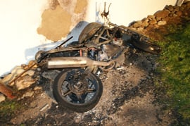 Hausfassade durch die Hitze des brennenden Motorrades Beschädigungen erlitt.