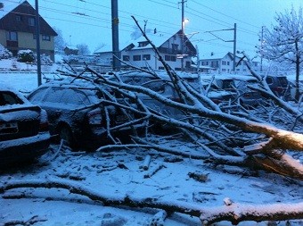 Infolge dee starken Nassschneefalls von heute früh ist bei der Park&Ride-Anlage beim Bahnhof Bubikon ein Baum von der gegenüberliegenden Bachböschung auf den Parkplatz Nord gestürzt. Nach Angaben der Feuerwehr Bubikon wurden mehrere parkierte Fahrzeuge beschädigt. Es entstand Sachschaden von über 10 000 Franken. Die um 07.23 alarmierte Feuerwehr Bubikon befreite die Autos von dem Baum und zersägte dem Stamm, soweit er in den Parkplatz ragte, vor Ort. Die beschädigten Fahrzeuge wurden, um weiteren schaden zu verhindern, abgedeckt.