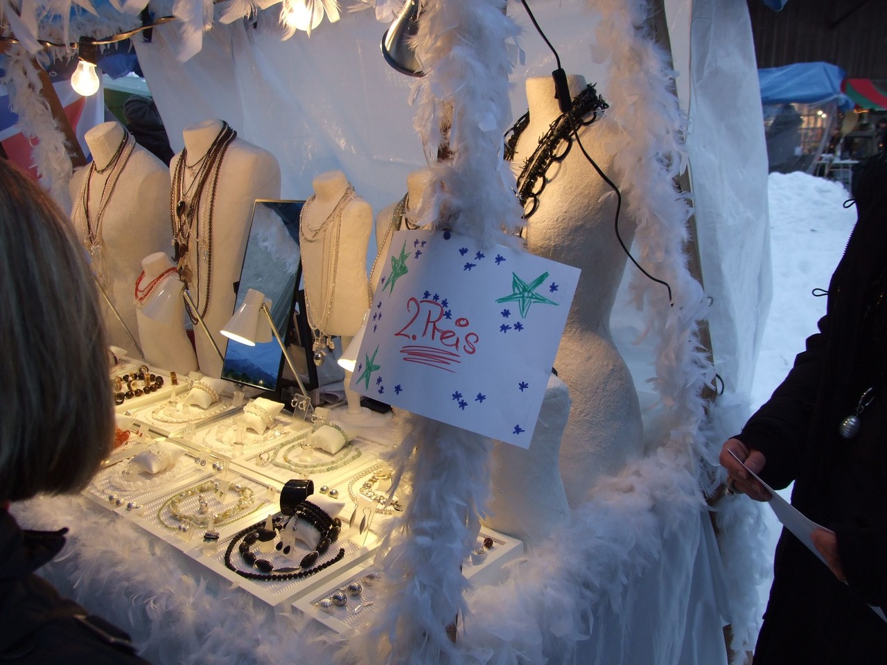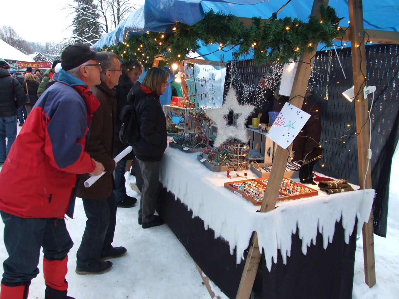 ...am diesjährigen Ritterhaus-Wienachtsmärt war der Stand von N. und B. Gubser, Galerie 61 (Mosaikarbeiten). Eine Jury, bestehend aus Mitgliedern der Kulturgruppe Bubikon und unter Beteiligung von Gemeindepräsident Bruno Franceschini, begutachtete am Nachmittag alle 58 Marktstände. Um 16.00 Uhr schliesslich schritt man zur Prämierung und überraschte die glücklichen Gewinner gleich am Stand. Der zweite Preis ging an Paola Ciot aus Gossau (Silber- und Edelsteinschmuck), im dritten Rang wurde Catia Gieringer aus Tagelswangen (Schmuck aus Silber, Halbedelsteinen, Gummi und Leder) prämiert.