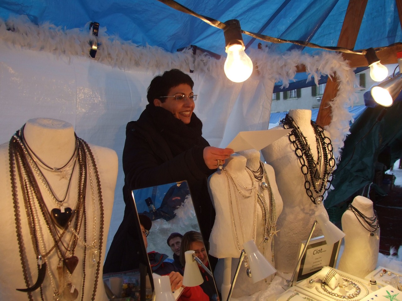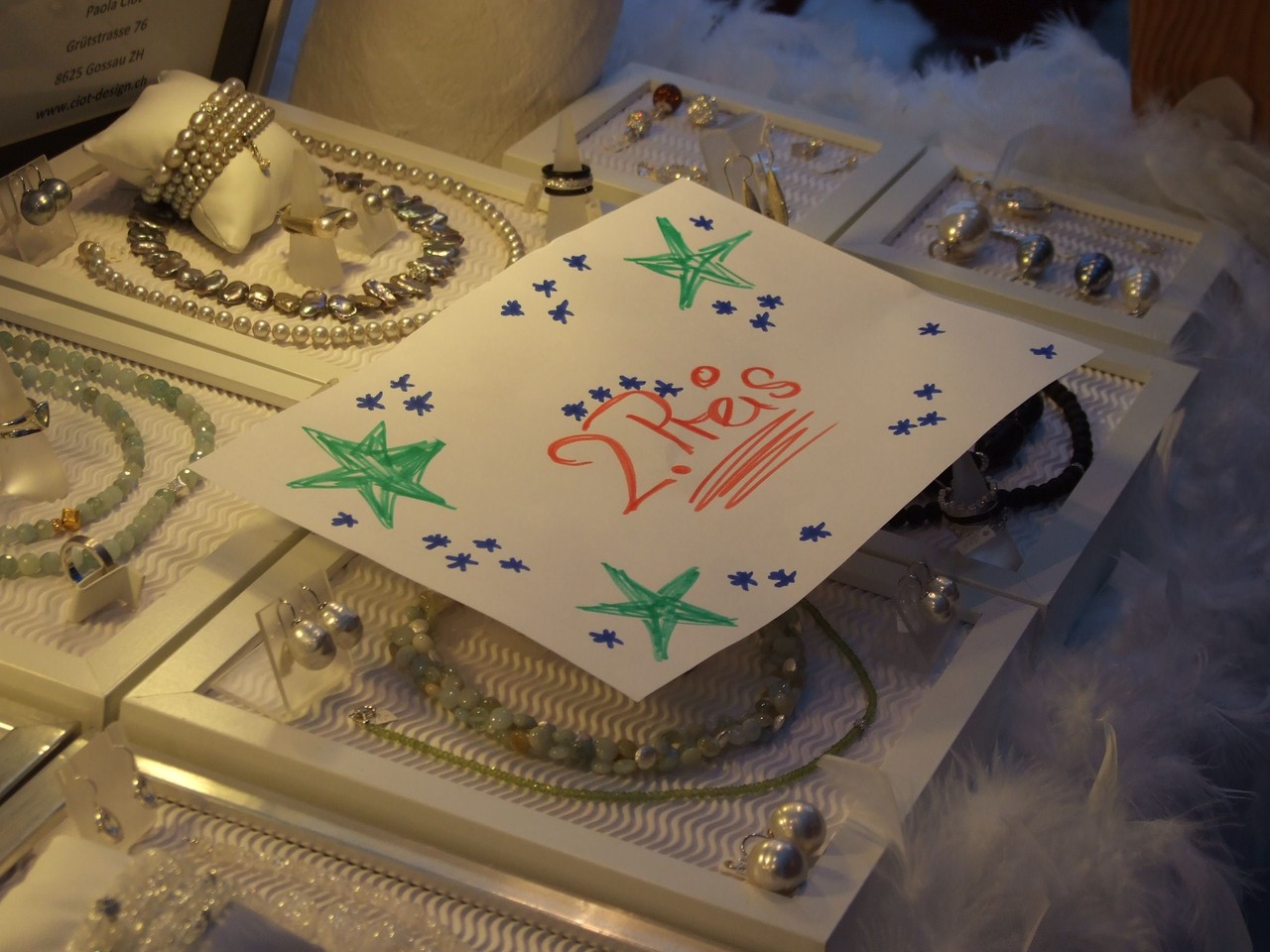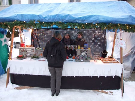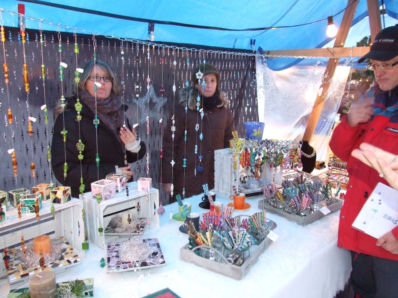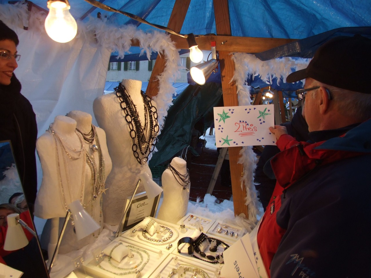 ...am diesjährigen Ritterhaus-Wienachtsmärt war der Stand von N. und B. Gubser, Galerie 61 (Mosaikarbeiten). Eine Jury, bestehend aus Mitgliedern der Kulturgruppe Bubikon und unter Beteiligung von Gemeindepräsident Bruno Franceschini, begutachtete am Nachmittag alle 58 Marktstände. Um 16.00 Uhr schliesslich schritt man zur Prämierung und überraschte die glücklichen Gewinner gleich am Stand. Der zweite Preis ging an Paola Ciot aus Gossau (Silber- und Edelsteinschmuck), im dritten Rang wurde Catia Gieringer aus Tagelswangen (Schmuck aus Silber, Halbedelsteinen, Gummi und Leder) prämiert.