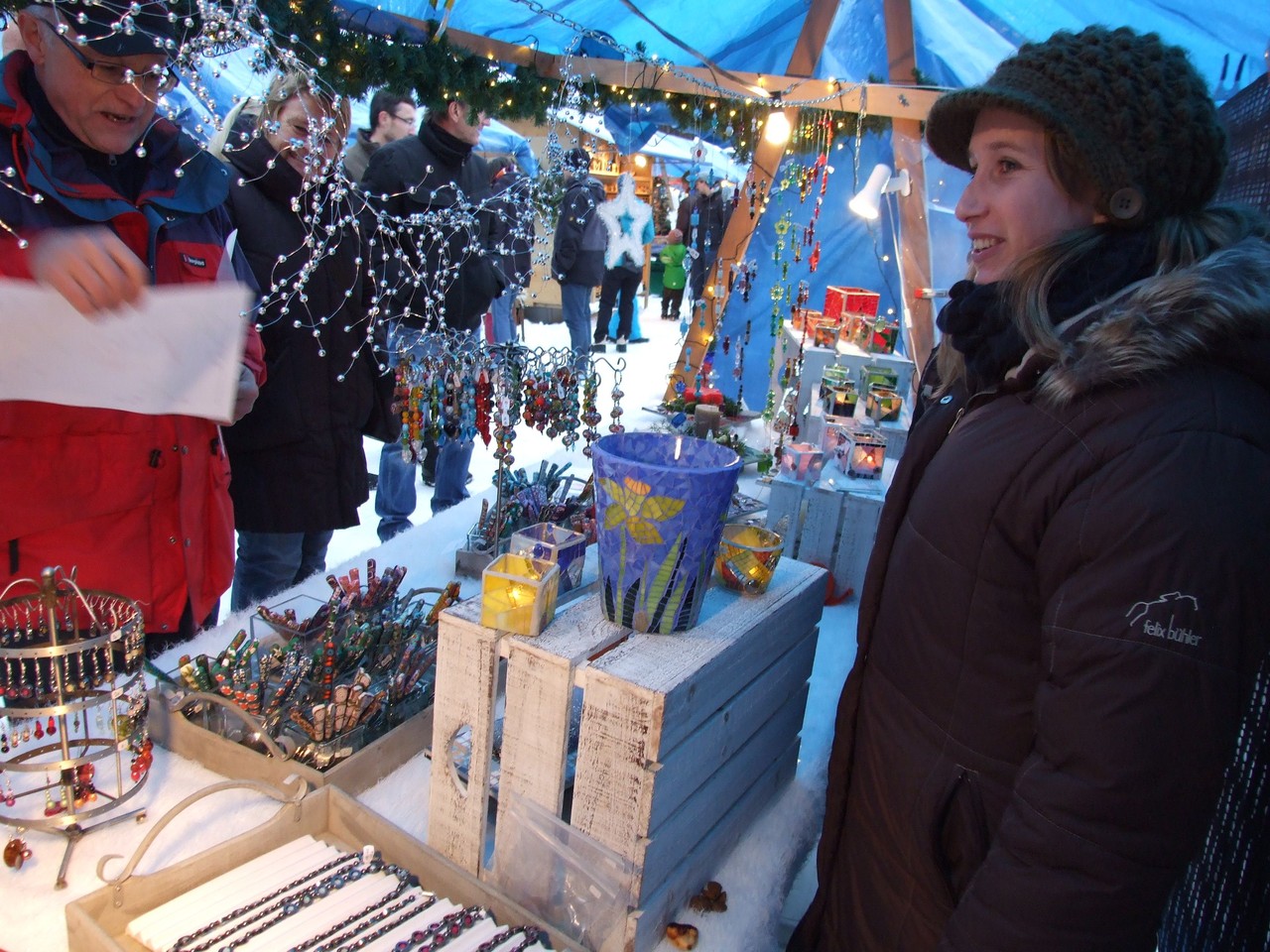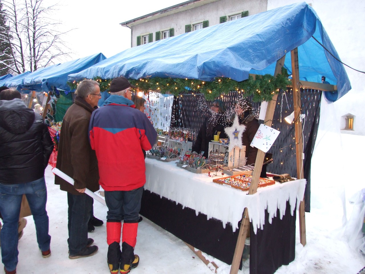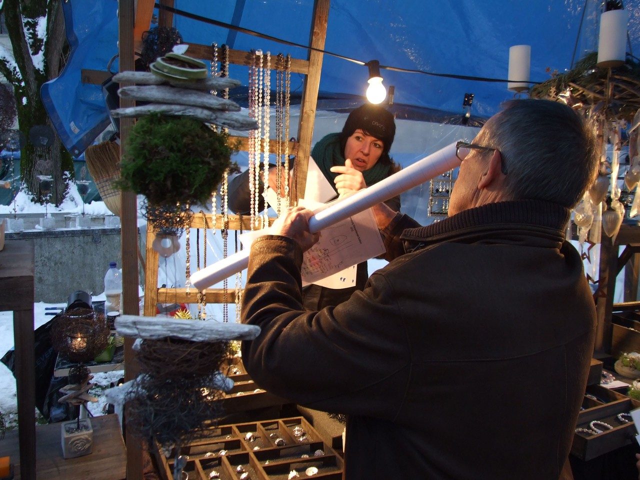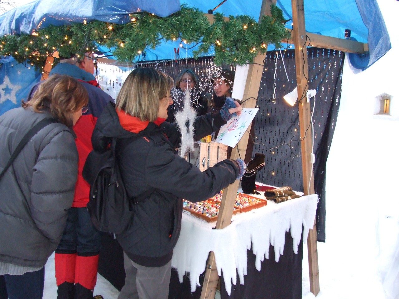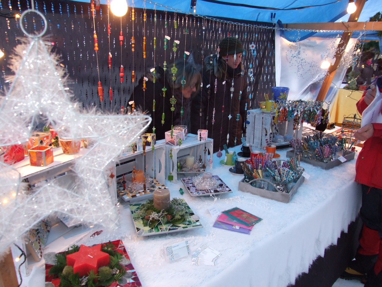 ...am diesjährigen Ritterhaus-Wienachtsmärt war der Stand von N. und B. Gubser, Galerie 61 (Mosaikarbeiten). Eine Jury, bestehend aus Mitgliedern der Kulturgruppe Bubikon und unter Beteiligung von Gemeindepräsident Bruno Franceschini, begutachtete am Nachmittag alle 58 Marktstände. Um 16.00 Uhr schliesslich schritt man zur Prämierung und überraschte die glücklichen Gewinner gleich am Stand. Der zweite Preis ging an Paola Ciot aus Gossau (Silber- und Edelsteinschmuck), im dritten Rang wurde Catia Gieringer aus Tagelswangen (Schmuck aus Silber, Halbedelsteinen, Gummi und Leder) prämiert.
