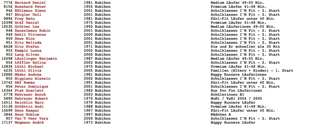 61 Läuferinnen und Läufer aus der Gemeinde Bubikon nehmen morgemn Sonntag, 16. Dezember 2012, am 36- Zürcher Silversterlauf teil, 30 aus Wolfhausen und 31 aus dem Ortsteil Bubikon. Darunter befinden sich auch zwölf Bubiker Schülerinnen und Schüler, die sich Rahmen der von der Migros lancierten Bewegungs-Initiative "I'm fit" angemeldet haben.