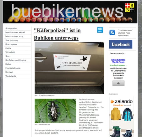 Anfang November hatte "buebikernews" berichtet, dass in Wolfhausen ein Einsatzfahrzeug des Eidgenössischen Pflanzenschutzdieses (EPDS) mit einem Spürhund in Wolfhausen gesichtet wurde. Dies legte die Vermutung nahe, dass in unserer Gemeinde ein Befall durch den gefürchteten Asiatischen Laubholzblockkäfer untersucht wurde.