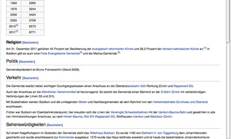 Wie alle Zürcher Gemeinden verfügt auch Bubikon auf Wikipedia über einen Eintrag. Erstellt wurde er am 13. Dezember 2004. Seither haben weit über 100 Wikipedianer immer wieder Änderungen daran vorgenommen. Das Resulat nach acht Jahren lässt sich aber keinswegs sehen: Der Eintrag ist, im Vergleich zu anderen Gemeinden, mehr als dürftig, fehler- und lückenhaft. Über Bubikon erfährt man ein paar Informationshäppchen über das Wappen, die Bevölkerungsentwicklung, die vorhandenen Anschlüsse an den öffentlichen Verkehr und das Ritterhaus, aber praktisch nichts über die Ortsgeschichte, das Wirtschaftsleben, die Kultur, Sport, Freizeit und Dorfleben. Unter "Politik" ist einzig vermerkt, dass der "Gemeindepräsident Bruno Franceschini (Stand 2009)" heisst. Unter "Persönlichkeiten" findet sich ein einziger Name. Der zugehörige Link führt allerdings ins Nichts, weil die Wiki-Administratoren diesen Eintrag offenbar bereits 2008 gelöscht haben. Ein Vergleich zum Beispiel mit Rüti lässt Bubikon alt aussehen. Immerhin wird noch auf den Ortsteil Wolfhausen, das einen eigenen – und ausführlicheren – Eintrag hat.