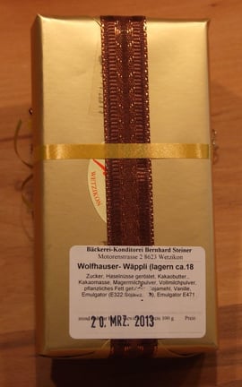 (Fragt die Kollegin:) "Haben wir ein Muster? Nein? Es ist einfach ein Schöggeli mit dem Wolfhauser Wappen."