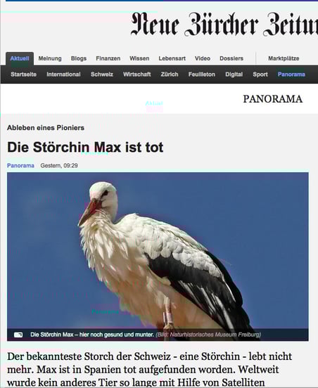 Die Störchin Max sei tot, melden die NZZ und viele andere Medien in der Schweiz. Irritierend an der Sache ist – wenigstens für mich – die noch nie zuvor gelesene weibliche Form "Störchin", die nicht nur zum Namen "Max" kontrastiert, sondern auch zur Überzeile "Ableben eines Pioniers". Warum nicht, wenn schon, Pionierin?