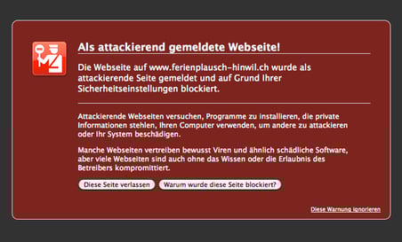 Wer derzeit versucht, ab der Website des Ferienplauschs des Bezirks Hinwil die Broschüre oder das Ferienplausch-Programm 2013 als PDF herunterzuladen, erhält – sofern sein Browser à jour ist – obenstehende Warnmeldung: Diese Website sei als "attackierend" gemeldet und aufgrund der Sicherheitseinstellungen des Browser blockert. Es bestehe die Gefahr, dass Programme installiert würden, um private Informationen zu stehlen oder das Betriebssystem zu beschädigen. Solche Attacken könnten auch ohne Wissen und Erlaubnis des Website-Betreibers erfolgen.
