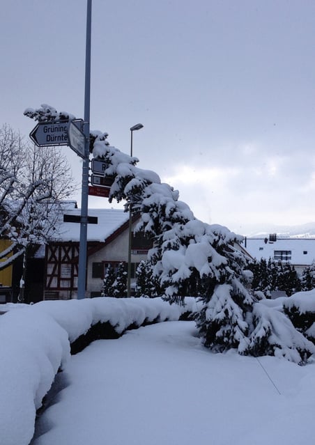 Viel Schnee ist gefallen in den vergangenen Tagen – und es soll noch mehr kommen! Diesem Nadelgehölz beim "Chez Janine" in Bubikon wird das alles langsam ein bisschen zu viel. "Da lehn' ich mich