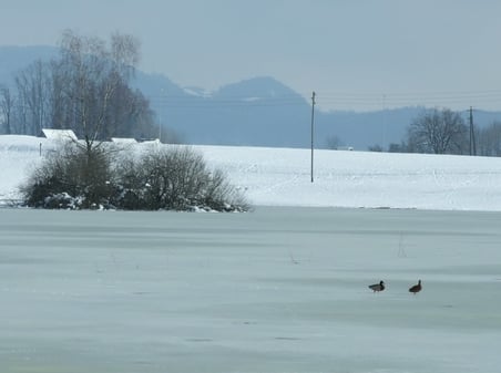 Eine freundliche Sonne hat heute nach den frostigen Tagen der letzten Woche ihre wärmenden Strahlen über Bubikon ausgebreitet. Und sofort wurde aus Schnee Matsch und aus Eis Sülze. Auch die Tiere spüren, dass der Frühling nah ist. Schliesslich kann man, dachte sich der listige Erpel, seiner Angebeteten auf schmelzendem Eis schon einmal ein bisschen den Hof machen.
