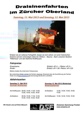Am Wochenende vom 11. und 12. Mai 2013 führt die "Draisinen Sammlung Fricktal" wiederum Draisenfahrten auf der alten UeBB-Bahnstrecke zwischen Bubikon und Wolfhausen durch. Anlass sind der Dorfmärt in Wolfhausen am Samstag und der Muttertag am Sonntag. Die Draise verkehrt fahrplanmäsig (siehe Bild rechts) am Samstag ab 09.00 Uhr und am Sonntag ab 13.00 Uhr. Die Fahrten finden allerdings nur bei schönem Wetter statt.