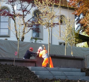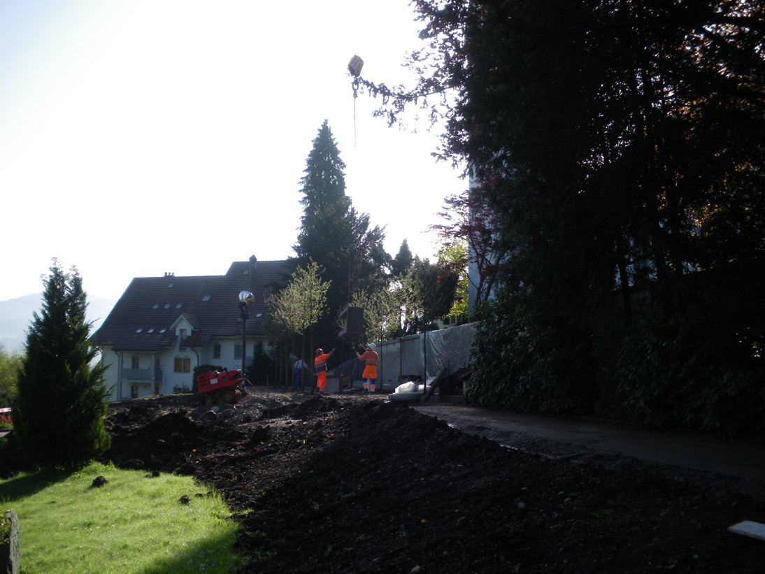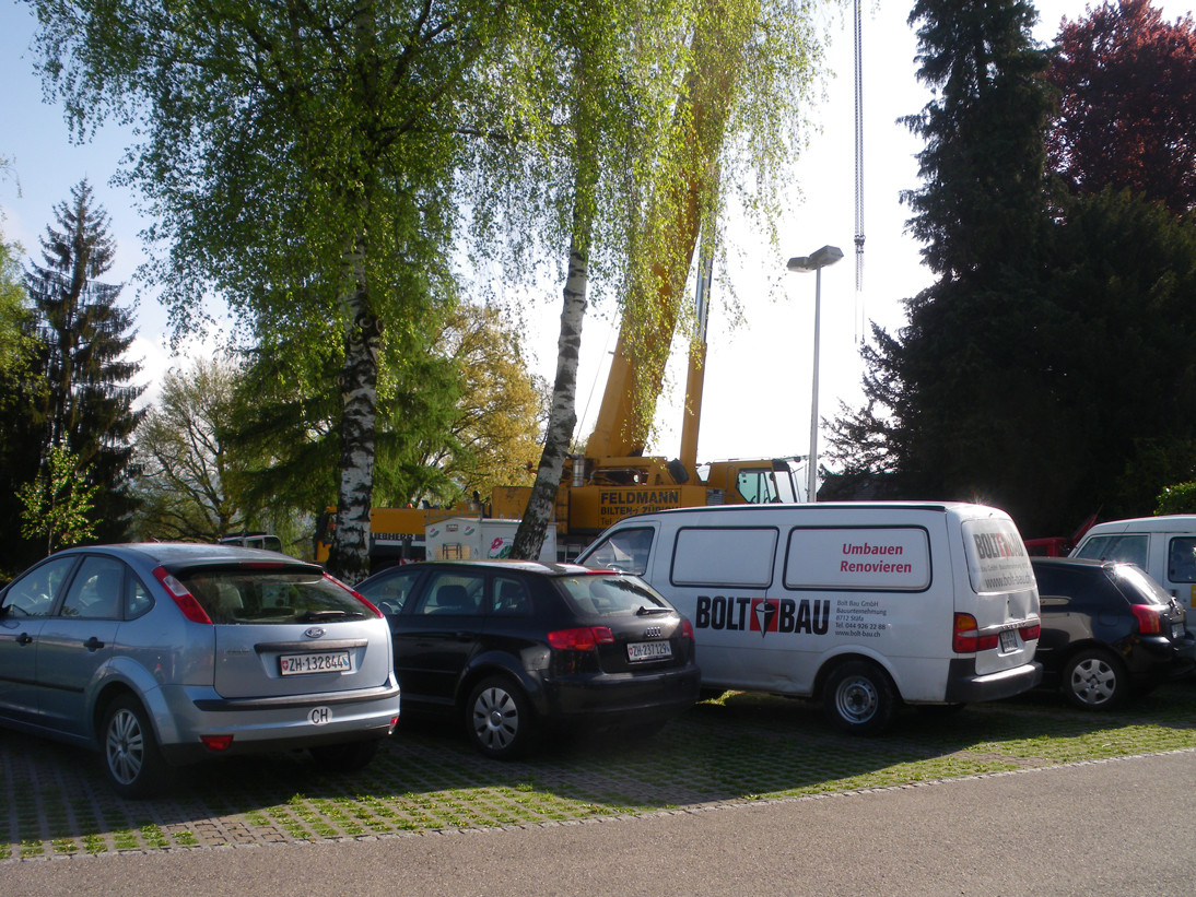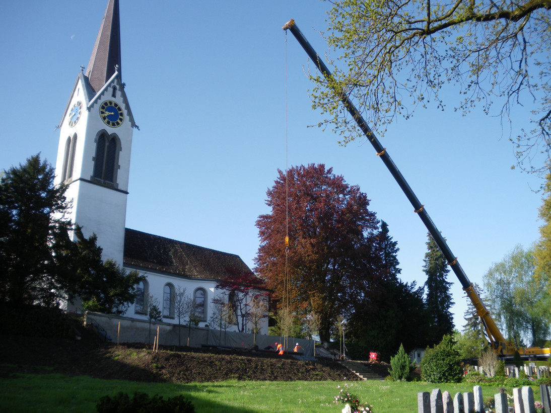 Die Bauunter-nehmung Bolt Bau GmbH in Stäfa hat am Freitag auf dem Friedhof Bubikon die drei Betonelemente für den Namenstisch des neuen Gemeinschaftsgrabs versetzt. Für das Versetzen war ein grosser 160 m/t-Autokran nötig, waren die einzelnen Elemente doch je etwa 3 Tonnen schwer, und der Standort des Tisches war über 40 Meter vom Abladeort entfernt.