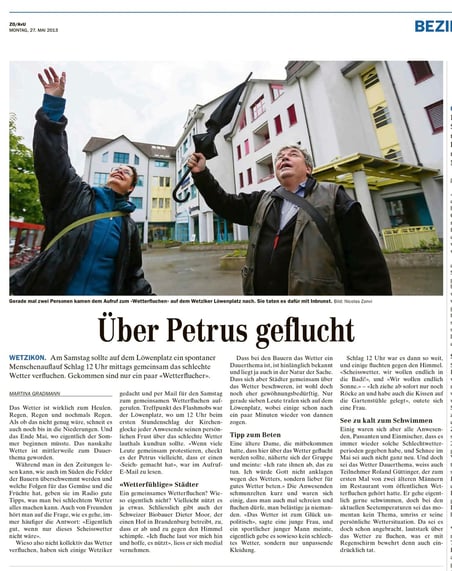 Ein schönes Beispiel finden wir in der heutigen Ausgabe: Da hat jemand (wer denn eigentlich?) für Samstag, 12.00 Uhr zu einem "Flashmob" auf dem Löwenplatz in Wetzikon aufgerufen, um über das miese Wetter zu fluchen. Bereits heute berichtet der ZO auf Seite 3 in der Aufmachergeschichte mit Bild über das Ereignis – an dem gerade mal 2 (zwei) Personen teilnahmen, wie die Zeitung kleinlaut einräumt.