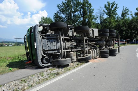 Bei einem Selbstunfall ist am Montagmittag (22.7.2013) in Grüningen ein Lastwagen umgekippt. Der Chauffeur erlitt mittelschwere Verletzungen.