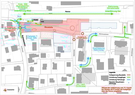 Stationsweg und Ebmattstrasse in Angriff genommen und dieser Bereich gesperrt. Die Zufahrt zu den angrenzenden Liegenschaften wird gewährleistet. Auch sind die Kurzzeitparkplätze und der Zugang