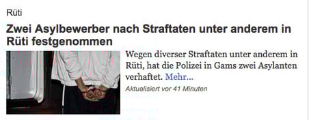"Zwei Asylbewerber nach Straftaten unter anderem in Rüti festgenommmen", meldet ZO Online heute. Kein Zweifel, dass diese Schlagzeile viele Klicks nach sich ziehen wird. Über 4 Millionen Mal sei ZO Online im August angeklickt worden, klopfte sich das Onlineportal diese Woche auf die Schulter und erklärte sich selber zur Nummer 1 der regionalen Newsportale im Kanton Zürich.