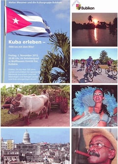 Am 1. November 2013 (20.00 Uhr, Geissbergsaal Wolfhausen) zeigt der Bubiker Dorfchronist und -Fotograf Walter Messmer eine neue Tonbildschau über Kuba. Messmer bereiste die Zuckerinsel mit dem Velo und legte rund 1000 Kilometer zurück. "Die erste Reise führt uns in den Osten, in das Herz der kubanischen Revolution. Die Leute sind ärmer als im Westen, heissblütiger. Die Touristen bleiben meistens im Westen an den Badestränden und in den Städten, die man für den Tourismus aufbaut", schreibt Walter Messmer, der mit seiner Tonbildschau diese zwei Seiten Kubas zeigen will. Der Eintritt zur Tonbildschau ist frei, es wird eine Kollekte erhoben.