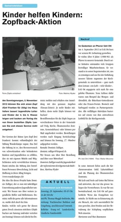 Am vergangenen Samstag haben Bubiker Mitttelstufe-Kinder und jugendliche Leiter Zöpfe gebacken, um mit dem Reinerlös – pro Zopf 3 Franken – die Stiftung Wunderlampe unterstützen zu können. Diese Stiftung erfüllt schwerkranken und behinderten Kindern Wünsche, die sie selber nicht verwirklichen können. Wie das Gemeindeblatt "Chileblick" der reformiertebn Kirchgemeinde Bubikon berichtet, stammt die Idee von Dominic Zulliger; umgesetzt wurde sie von zahlreichen jugendlichen Helferinnen und Helfern unter dem Patront der reformierten Jugendarbeiterinnen Martina Wyder und Esther Luchsinger. Insgesamt wurden rund 150 Zöpfe gebacken und 620 Franken gesammelt. Beteiligt an der Aktion waren 17 begeisterte Kinder und acht Konfirmanden.