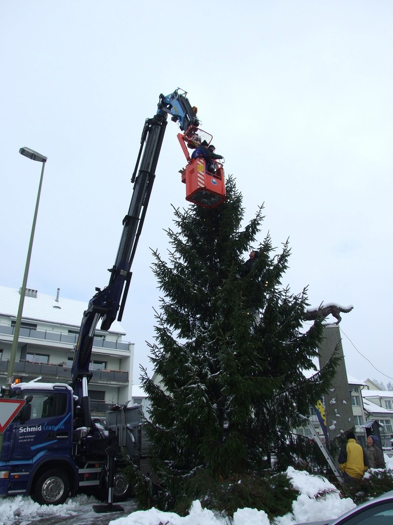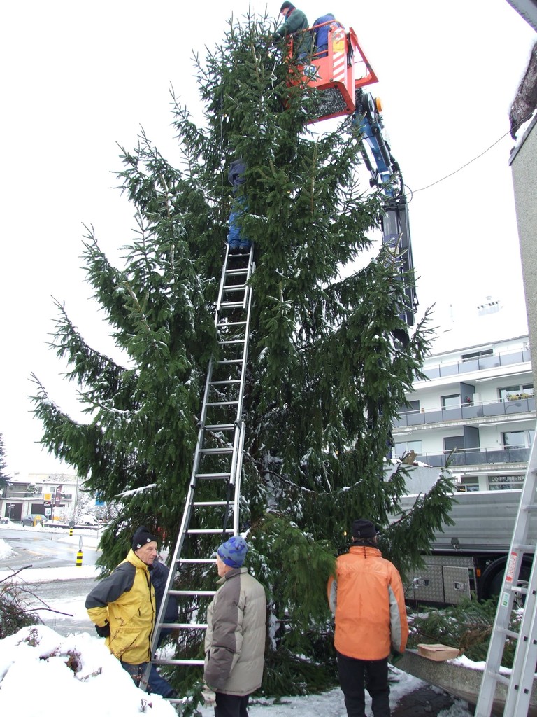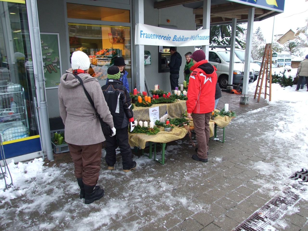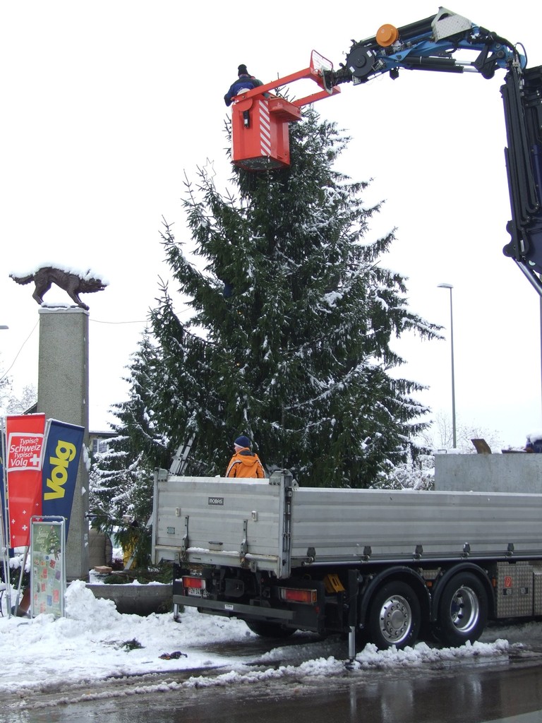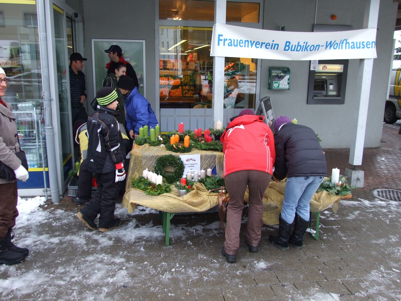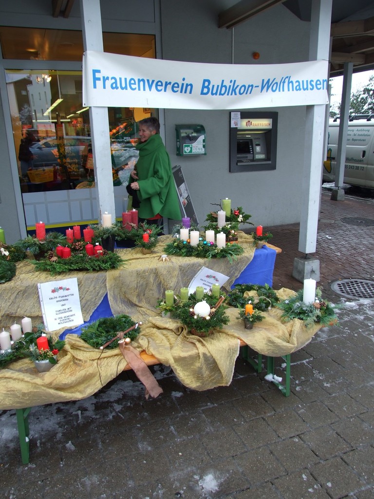 Eine Woche nach Bubikon hat auch Wolfhausen einen Dorfchristbaum – gut bewacht vom tierischen Wahrzeichen Wolfhausens, das über Nacht adventlich eingeschneit wurde. Trotz Chränzli hat der Männerturnverein Wolfhausen am Abend den Baum am oberen Rennweg noch vor dem Schneefall gefällt, wie MTW-Präsident Paul Bolt erzählt. Und frühmorgens wurde die mächtige Tanne dann beim Dorfbrunnen gestellt und mit Kerzen geschmückt. Für besondere Adventsstimmung sorgte unmittelbar daneben der Stand des Frauenvereins Bubikon-Wolfhausen, wo kunstvoll gekranzte Adventsgestecke und -Kränze feilgeboten wurden. Adventskränze des Frauenvereins waren auch vor dem Volg in Bubikon zu haben.