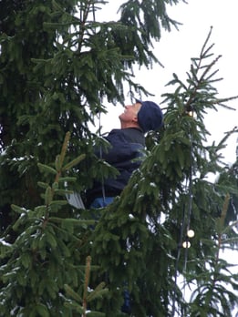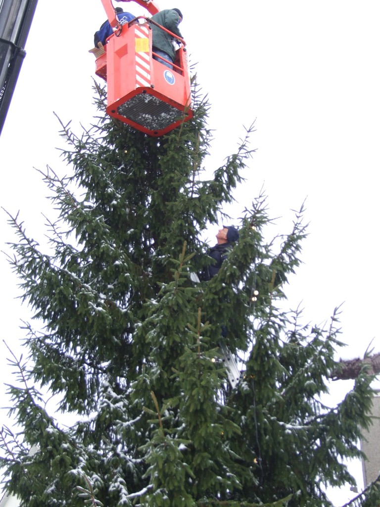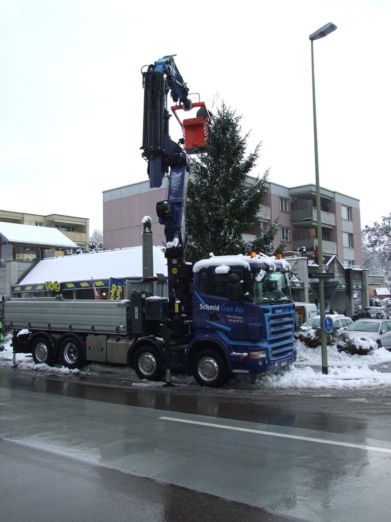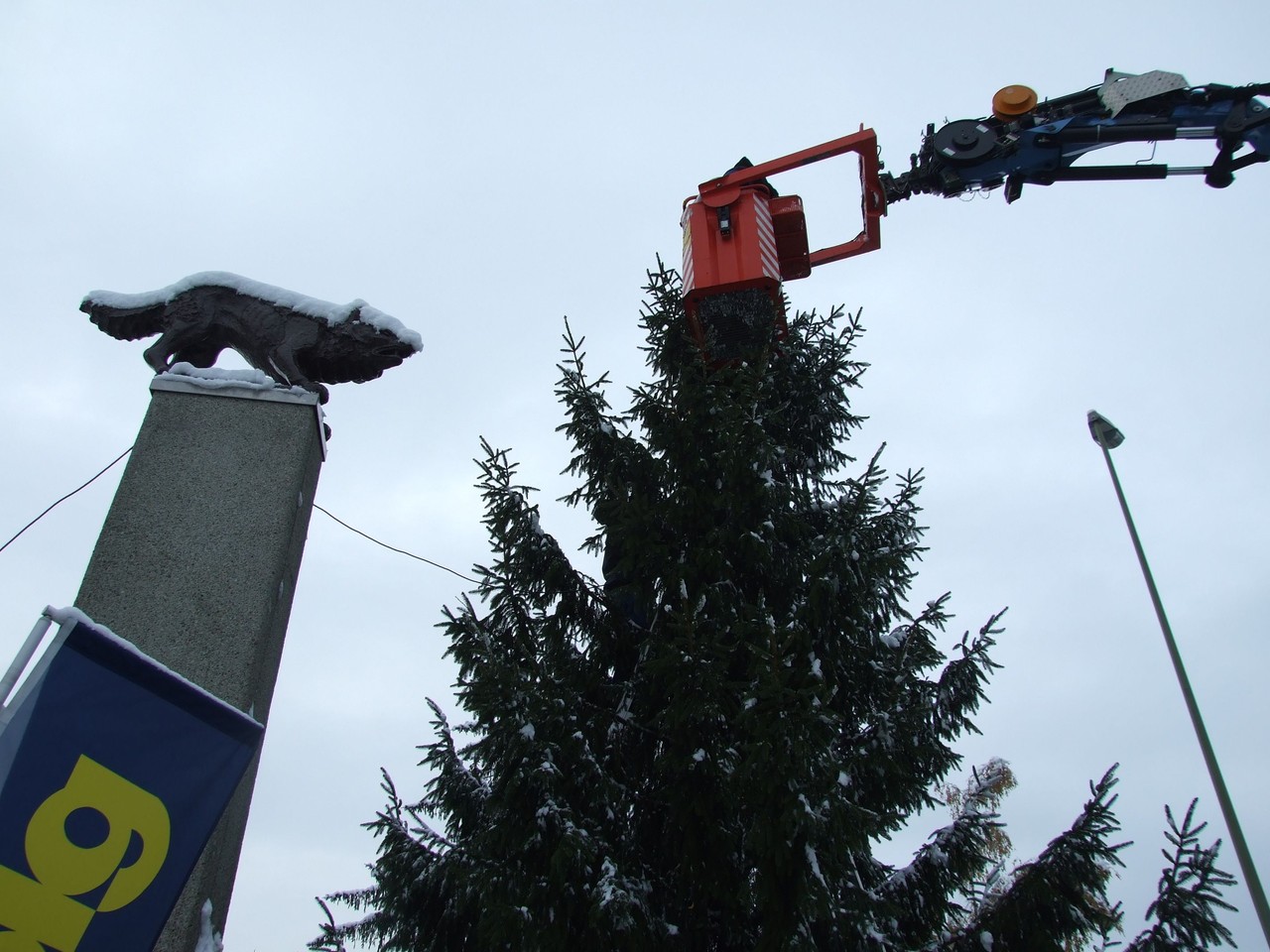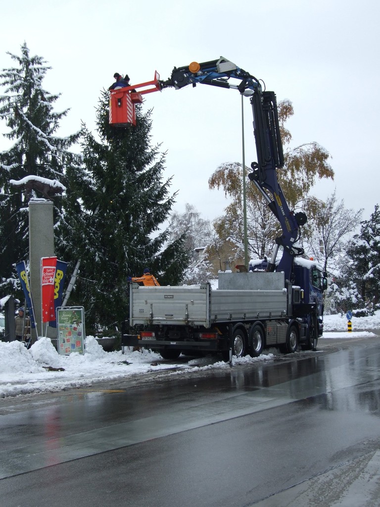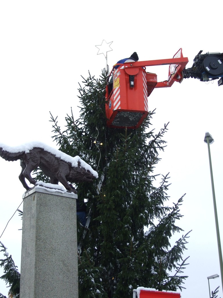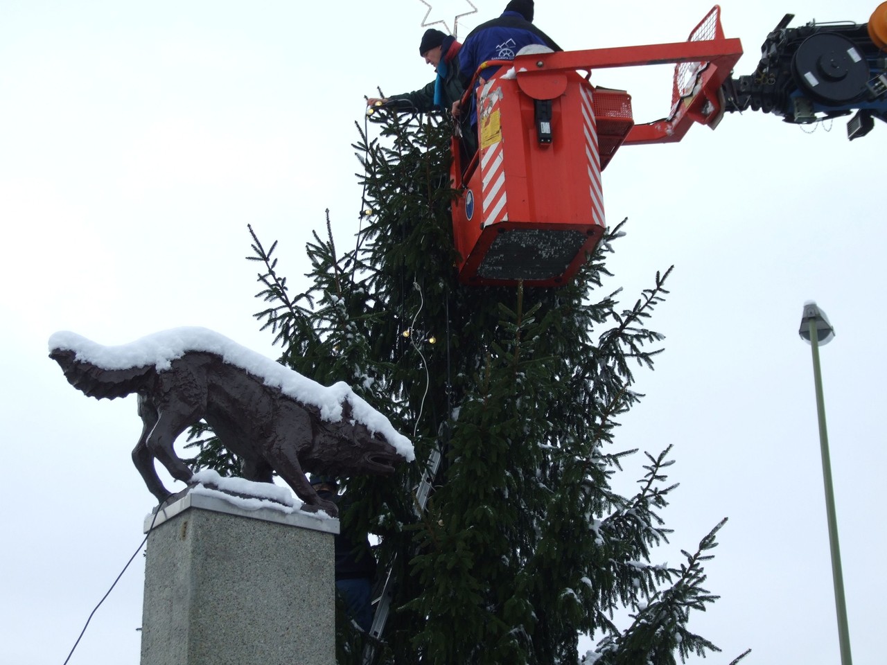 Eine Woche nach Bubikon hat auch Wolfhausen einen Dorfchristbaum – gut bewacht vom tierischen Wahrzeichen Wolfhausens, das über Nacht adventlich eingeschneit wurde. Trotz Chränzli hat der Männerturnverein Wolfhausen am Abend den Baum am oberen Rennweg noch vor dem Schneefall gefällt, wie MTW-Präsident Paul Bolt erzählt. Und frühmorgens wurde die mächtige Tanne dann beim Dorfbrunnen gestellt und mit Kerzen geschmückt. Für besondere Adventsstimmung sorgte unmittelbar daneben der Stand des Frauenvereins Bubikon-Wolfhausen, wo kunstvoll gekranzte Adventsgestecke und -Kränze feilgeboten wurden. Adventskränze des Frauenvereins waren auch vor dem Volg in Bubikon zu haben.