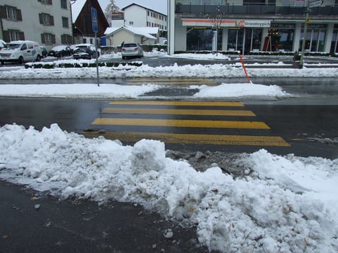 So ist es nach jedem Schneefall: Während die Fahrbahnen bereits nach kurzer Zeit schwarzgeräumt sind und der Verkehr wieder in ungedrosseltem Tempo rollt, bilden die Fussgängerstreifen für betagte Menschen mit rollbaren Gehhilfen oder auch für Frauen mit Kinderwagen noch lange unüberwindbare Hindernisse. Unser Bild zeigt den Fussgängerübergang beim Freihof in Wolfhausen am Samstagvormittag.