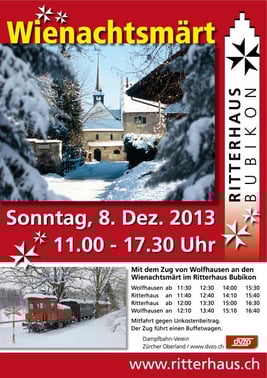Infolge der Bauarbeiten im Zusammenhang mit der Neugestaltung des Bahnhofplatzes und zusätzlich erschwert durch den frühen Schneefall ist das Parkplatzangebot rund um das Ritterhaus Bubikon für den diesjährtigen Wienachtsmärt (Sonntag, 8. Dezember 2013) stark eingeschränkt. "Bubiker sollten ihr Auto lieber zu Hause lassen und einen Spaziergang geniessen", mahnt Dölf Burkard, Präsident der Ritterhausgesellschaft: "Und für die Wolfhauser besteht ja das Angebot, mit dem historischen Zug zum Ritterhaus zu fahren." Auch auswärtige Besucher erreichen den beliebten Markt bequem mit dem öffentlichen Verkehr: S5 oder S15 bis Bubikon, dann Spaziergang zum Ritterhaus oder mit dem Bus 880 bis zur Haltestelle "Bubikon Dorf".