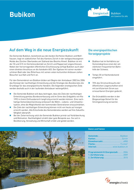 Wie bereits kurz berichtet, bleibt Bubikon Energiestadt: Wie Gemeinderat Daniel List an der Gemindeversammlung vom Mittwoch bekanntgab, hat Bubikon die Rezertifizierung des Labels mit 61 Prozentpunkten geschafft. Bei der ersten Zertifizierung im November 2009 hatte Bubikon noch 55 Prozentpunkte erreicht. Zusammen mit Bubikon wurden 19 weitere Energiestädte rezertifiziert und neun Gemeinden neu zertifiziert.