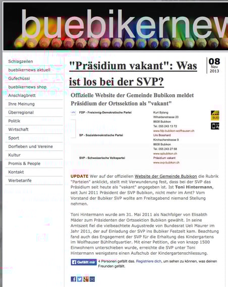 Im November eskalierte ein Knatsch innerhalb der Bubikber SVP, der schon seit Anfang Oktober geschwelt hatte. Damals nominierte der Vorstand am selbernTag, als Schulpräsident Hans Murer seinen Rücktritt auf Ende Amtsperiode bekanntgab, das SVP-Vorstandsmitglied Ueli Giger als Kandidaten. Mit dieser Nomination düpierte man offensichtlich die bisherige SVP-Schulpflegerin Andrea Keller, die ebenfalls für das Präsidium hätte kandidieren wollen. Im November überstürzten sich die Ereignisse: Zunächst trat SVP-Präsidsent Toni Hintermann per sofort zurück, wenig später wurde bekannt, dass Andrea Keller die SVP verlassen hat und nun als Parteilose für das Schulpräsidium kandidiert. Erst im Januar soll eine ausserordentliche SVP-Generalversammlung entscheiden, ob die Nominierung Ueli Gigers bestätigt werden soll.