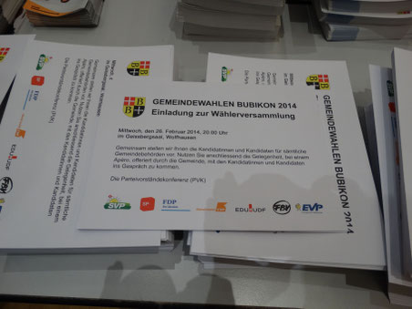 Mit dem Wahlkuvert wird gleichzeitig auch für die Wählerversammlung vom 26. Februar 2014 im Geissbergsaal eingeladen. Hier haben alle Kandidierenden Gelegenheit, sich kurz vorzustellen und sich beim anschliessenden Apéro mit der Bevölkerung auszutauschen.