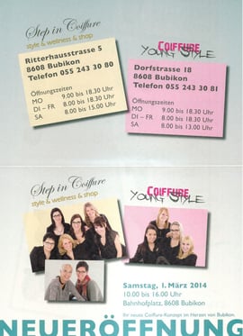 In die neu erstellte Überbauung am Bahnhof in Bubikon kommt Leben: Am 1. März feiert das Bubiker Coiffure-Geschäft "Step in" Neueröffnung in den neuen Räumlichkeiten an der Ritterhausstrasse 5 – als erstes Geschäft am neuen Bahnhofplatz. Wie aus einem am Donnerstag in alle Haushaltungen verschickten Flyer hervorgeht, ist ein "neues Coiffure-Konzept im Herzen von Bubikon" geplant: "Step in Coiffure" mit "Step in Shop" (Farb-, Stil- Accessoir- und Outfitberatung) am neuen Standort sowie "Coiffure Young Style" an der bisherigen Adresse Dorfstrasse 18 für "individuelles Hairstyling zu günstigen Preisen".