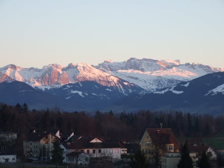 Der Abend senkt sich über Wolfhausen: Die letzten Sonnenstrahlen eines zauberhaften Frühlngstags tauchen die Glarner Alpen in ein sanftes Rosa und lassen die tief verschneiten Gipfel noch näher rücken. Warum nicht noch rasch zum Mürtschenstock spazieren oder gar aufs Vrenelisgärtli, könnte man fast denken.