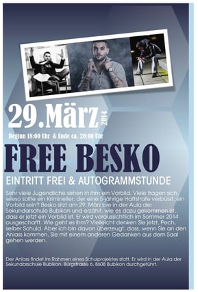 Der junge Zürcher Rapper Besko sitzt eine fünfjährige Haftstrafe ab – voraussichtlich im Sommer 2014 wird er ausgeschafft. Für viele Jugendliche aber ist Besko ein Vorbild, mit über 10 000 Facebook-Fans. Warum das so ist – dieser Frage will der Bubiker Drittsekschüler Mergim Ferizi in seiner Abschlussarbeit nachgehen. Im Rahmen dieses Projekts wird Besko am 29. März 2014 um 18.00 Uhr in der Aula der Sekundarschule Bubikon Rede und Antwort stehen.
